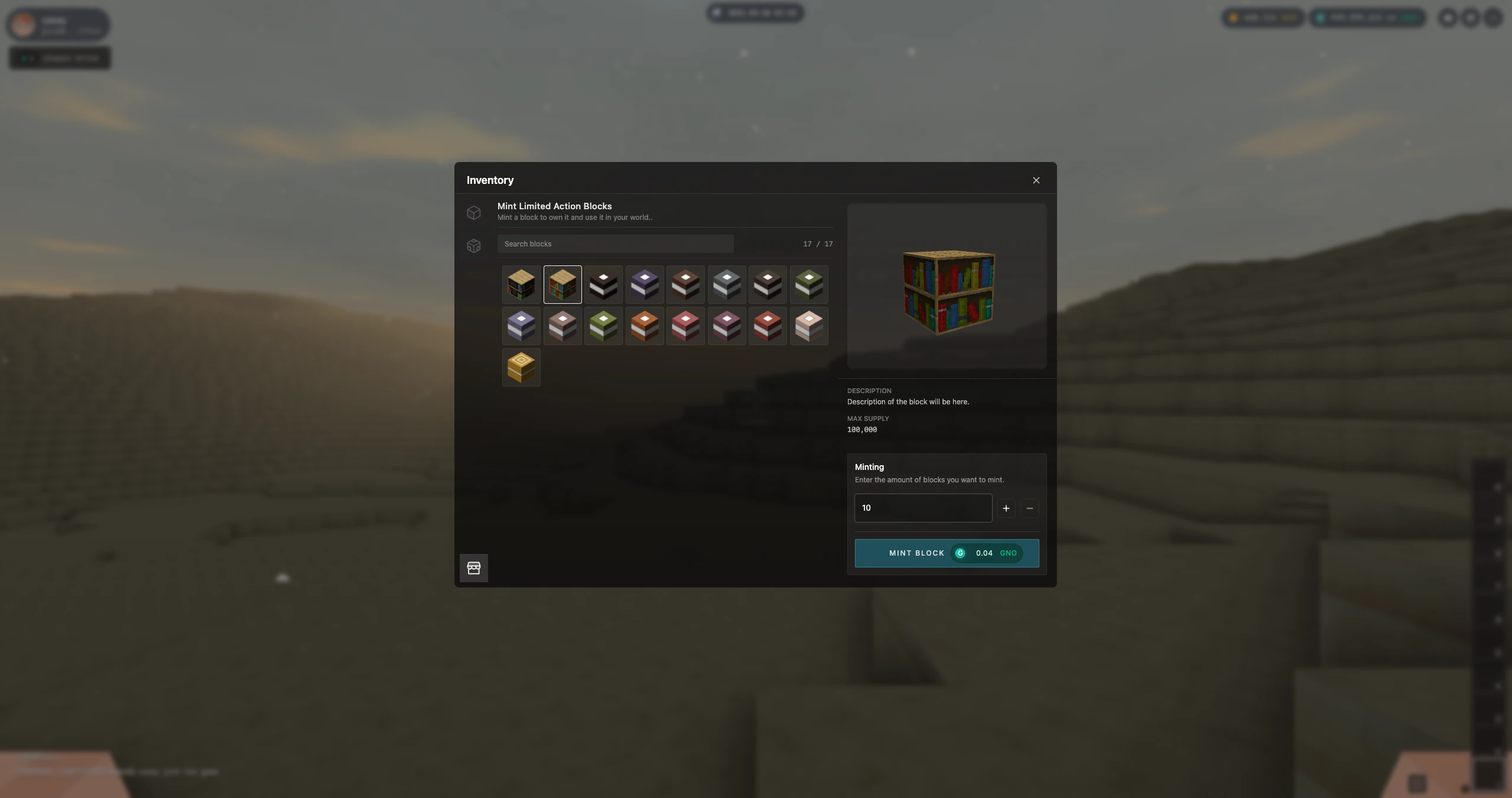 Use contract blocks (feature blocks) to shape and decorate your world. Buy them from the Shop, mint them into your inventory, then place and use them in your Realm. Installing, removing, and using contract blocks are all recorded on-chain.